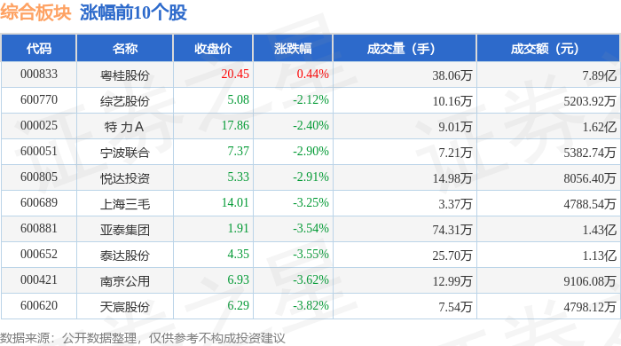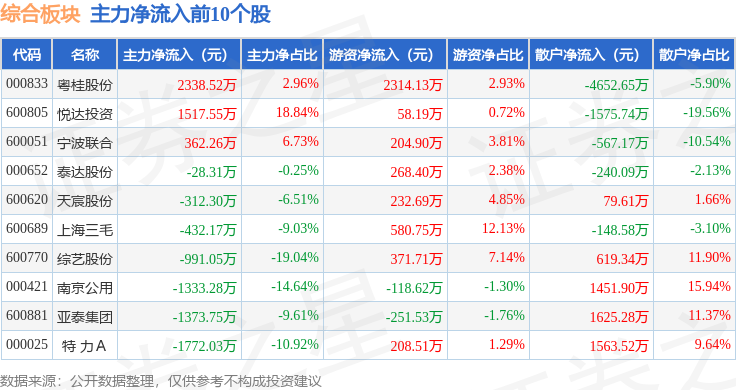 从资金流向上来看,当日综合板块主力资金净流出1.9亿元,游资资金净流出1901.37万元,散户资金净流入2.09亿元。综合板块个股资金流向见下表: