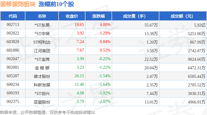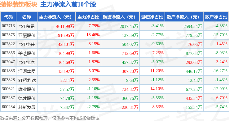 从资金流向上来看,当日装修装饰板块主力资金净流出6.51亿元,游资资金净流入2.85亿元,散户资金净流入3.66亿元。装修装饰板块个股资金流向见下表: