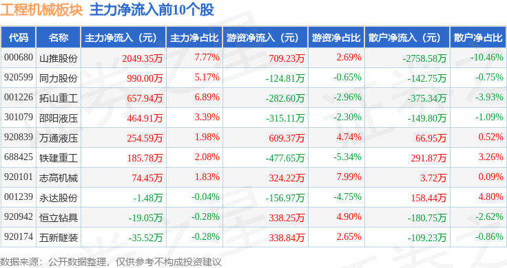 从资金流向上来看,当日工程机械板块主力资金净流出8.74亿元,游资资金净流入1.17亿元,散户资金净流入7.57亿元。工程机械板块个股资金流向见下表: