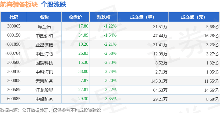 证券之星消息,12月11日航海装备板块较上一交易日下跌1.95%,中船防务领跌。当日上证指数报收于3873.32,下跌0.7%。深证成指报收于13147.39,下跌1.27%。航海装备板块个股涨跌见下表: