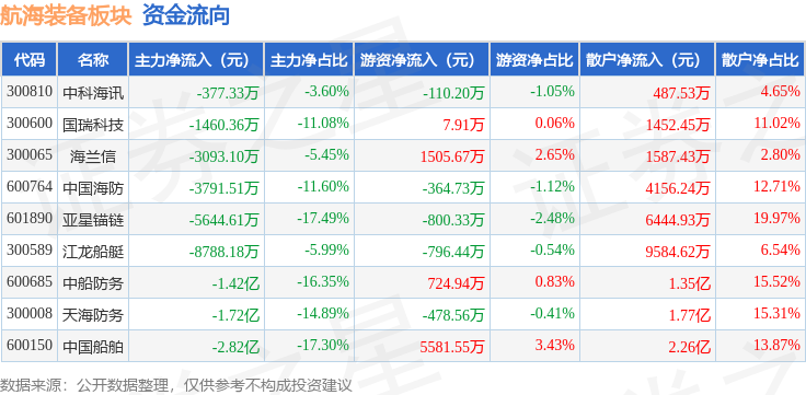 从资金流向上来看,当日航海装备板块主力资金净流出8.27亿元,游资资金净流入5269.82万元,散户资金净流入7.75亿元。航海装备板块个股资金流向见下表:
