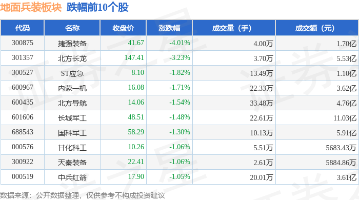 证券之星消息,12月11日地面兵装板块较上一交易日下跌0.83%,捷强装备领跌。当日上证指数报收于3873.32,下跌0.7%。深证成指报收于13147.39,下跌1.27%。地面兵装板块个股涨跌见下表: