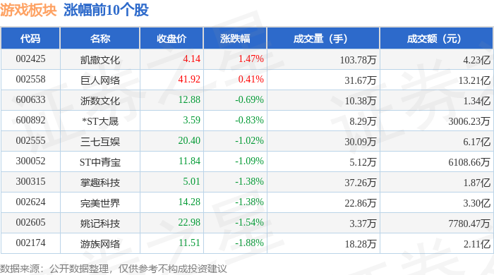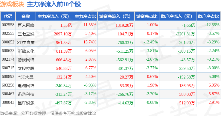 从资金流向上来看,当日游戏板块主力资金净流出10.88亿元,游资资金净流入4.54亿元,散户资金净流入6.34亿元。游戏板块个股资金流向见下表: