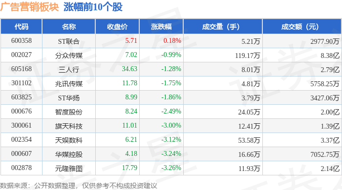 证券之星消息,12月11日广告营销板块较上一交易日下跌3.13%,新 华 都领跌。当日上证指数报收于3873.32,下跌0.7%。深证成指报收于13147.39,下跌1.27%。广告营销板块个股涨跌见下表: