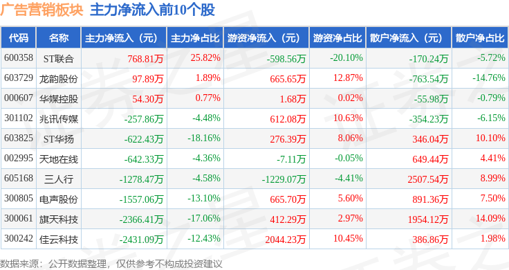 从资金流向上来看,当日广告营销板块主力资金净流出22.5亿元,游资资金净流入8109.75万元,散户资金净流入21.69亿元。广告营销板块个股资金流向见下表: