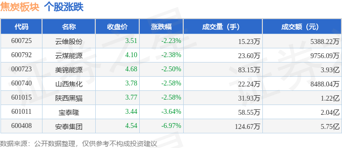 证券之星消息,12月11日焦炭板块较上一交易日下跌2.99%,安泰集团领跌。当日上证指数报收于3873.32,下跌0.7%。深证成指报收于13147.39,下跌1.27%。焦炭板块个股涨跌见下表: