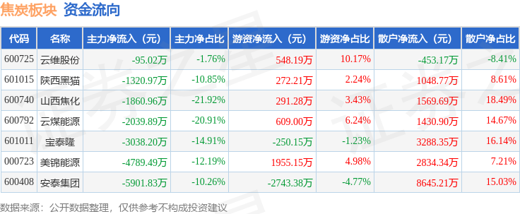 从资金流向上来看,当日焦炭板块主力资金净流出1.9亿元,游资资金净流入682.29万元,散户资金净流入1.84亿元。焦炭板块个股资金流向见下表: