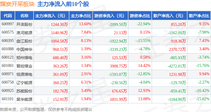 从资金流向上来看,当日煤炭开采板块主力资金净流出3.65亿元,游资资金净流入6139.37万元,散户资金净流入3.04亿元。煤炭开采板块个股资金流向见下表: