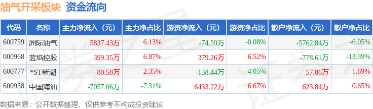 从资金流向上来看,当日油气开采板块主力资金净流出739.69万元,游资资金净流入6599.45万元,散户资金净流出5859.75万元。油气开采板块个股资金流向见下表: