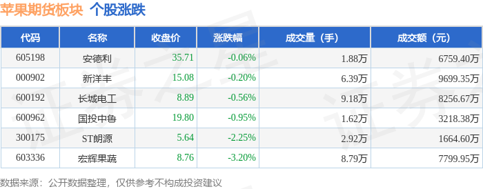 证券之星消息,12月11日苹果期货板块较上一交易日下跌0.79%,宏辉果蔬领跌。当日上证指数报收于3873.32,下跌0.7%。深证成指报收于13147.39,下跌1.27%。苹果期货板块个股涨跌见下表: