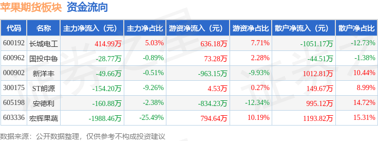 从资金流向上来看,当日苹果期货板块主力资金净流出1966.98万元,游资资金净流出288.75万元,散户资金净流入2255.73万元。苹果期货板块个股资金流向见下表: