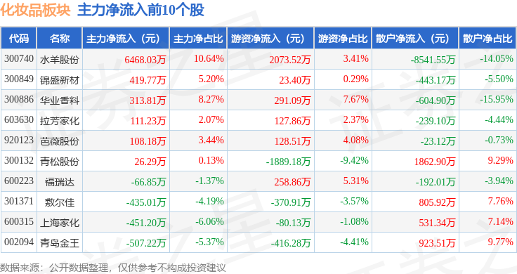 从资金流向上来看,当日化妆品板块主力资金净流入338.81万元,游资资金净流入397.03万元,散户资金净流出735.84万元。化妆品板块个股资金流向见下表: