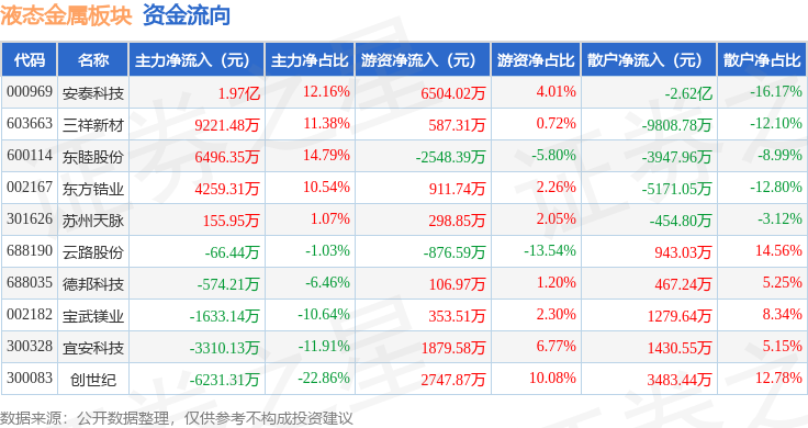 从资金流向上来看,当日液态金属板块主力资金净流入2.8亿元,游资资金净流入9964.85万元,散户资金净流出3.8亿元。液态金属板块个股资金流向见下表: