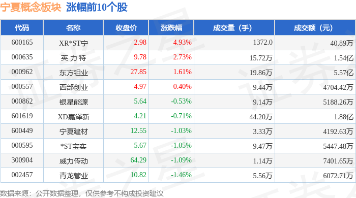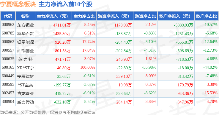 从资金流向上来看,当日宁夏概念板块主力资金净流出1.81亿元,游资资金净流入9526.53万元,散户资金净流入8578.69万元。宁夏概念板块个股资金流向见下表: