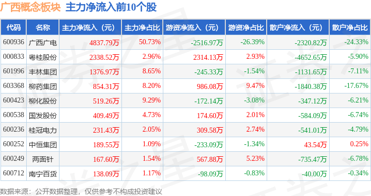 从资金流向上来看,当日广西概念板块主力资金净流出2.92亿元,游资资金净流入5368.53万元,散户资金净流入2.38亿元。广西概念板块个股资金流向见下表: