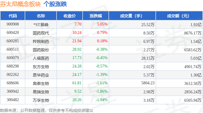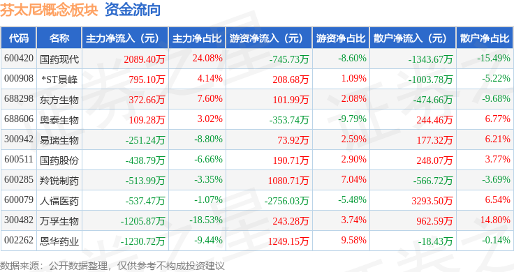从资金流向上来看,当日芬太尼概念板块主力资金净流出811.63万元,游资资金净流出707.06万元,散户资金净流入1518.7万元。芬太尼概念板块个股资金流向见下表: