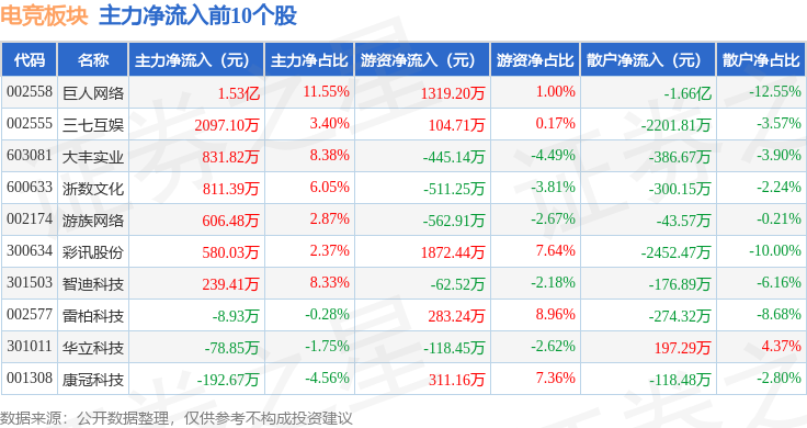 从资金流向上来看,当日电竞板块主力资金净流出10.57亿元,游资资金净流入4.07亿元,散户资金净流入6.5亿元。电竞板块个股资金流向见下表: