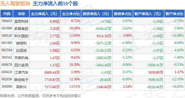从资金流向上来看,当日无人驾驶板块主力资金净流出104.18亿元,游资资金净流入19.26亿元,散户资金净流入84.92亿元。无人驾驶板块个股资金流向见下表:
