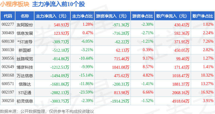 从资金流向上来看,当日小程序板块主力资金净流出4.76亿元,游资资金净流入5785.77万元,散户资金净流入4.18亿元。小程序板块个股资金流向见下表: