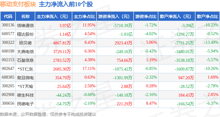 从资金流向上来看,当日移动支付板块主力资金净流出17.83亿元,游资资金净流入1.65亿元,散户资金净流入16.19亿元。移动支付板块个股资金流向见下表: