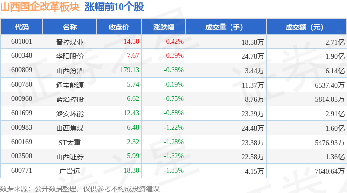 从资金流向上来看,当日山西国企改革板块主力资金净流出4.19亿元,游资资金净流入1.3亿元,散户资金净流入2.88亿元。山西国企改革板块个股资金流向见下表:
