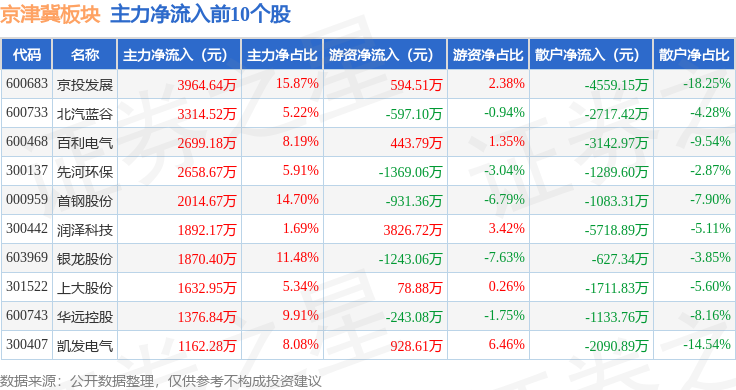 从资金流向上来看,当日京津冀板块主力资金净流出30.44亿元,游资资金净流入8.32亿元,散户资金净流入22.12亿元。京津冀板块个股资金流向见下表: