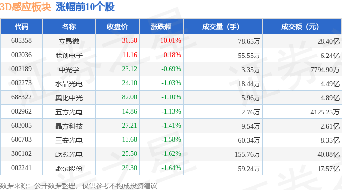 证券之星消息,12月11日3D感应板块较上一交易日下跌1.4%,光迅科技领跌。当日上证指数报收于3873.32,下跌0.7%。深证成指报收于13147.39,下跌1.27%。3D感应板块个股涨跌见下表: