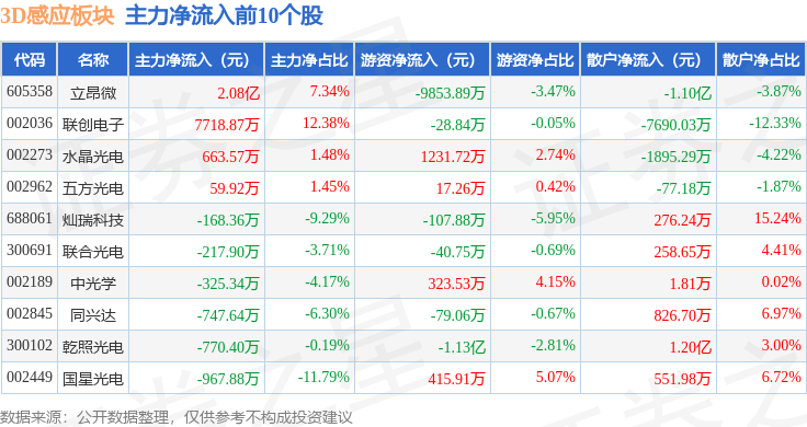 从资金流向上来看,当日3D感应板块主力资金净流出10.04亿元,游资资金净流出403.31万元,散户资金净流入10.08亿元。3D感应板块个股资金流向见下表: