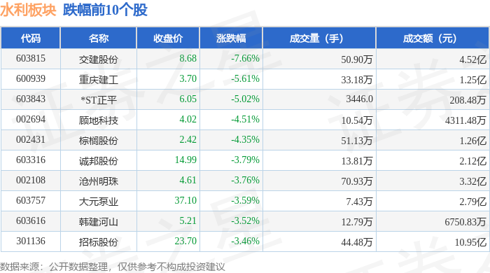证券之星消息,12月11日水利板块较上一交易日下跌0.72%,交建股份领跌。当日上证指数报收于3873.32,下跌0.7%。深证成指报收于13147.39,下跌1.27%。水利板块个股涨跌见下表: