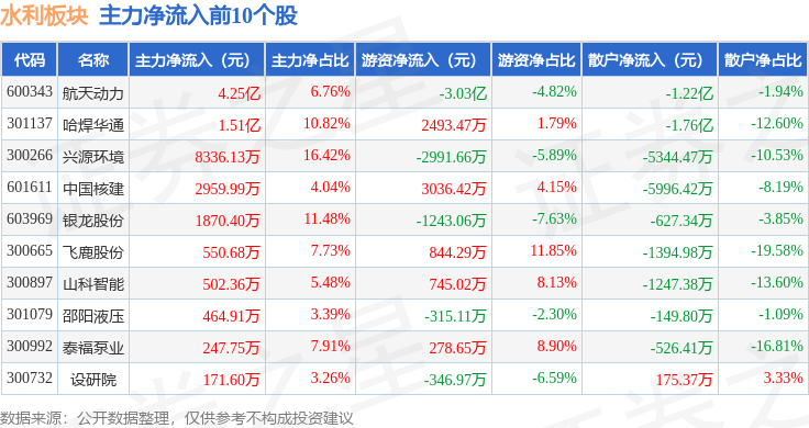 从资金流向上来看,当日水利板块主力资金净流出1.17亿元,游资资金净流出1.24亿元,散户资金净流入2.41亿元。水利板块个股资金流向见下表: