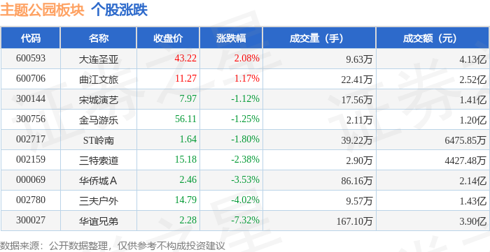 证券之星消息,12月11日主题公园板块较上一交易日下跌2.16%,华谊兄弟领跌。当日上证指数报收于3873.32,下跌0.7%。深证成指报收于13147.39,下跌1.27%。主题公园板块个股涨跌见下表:
