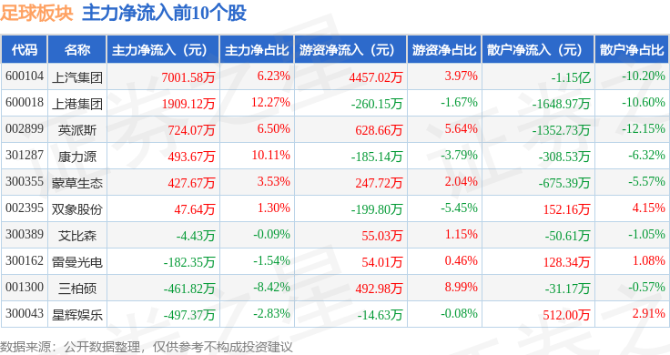 从资金流向上来看,当日足球板块主力资金净流出4.67亿元,游资资金净流入1.13亿元,散户资金净流入3.54亿元。足球板块个股资金流向见下表: