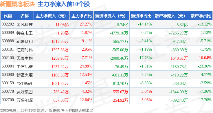 从资金流向上来看,当日新疆概念板块主力资金净流入1.98亿元,游资资金净流出3.34亿元,散户资金净流入1.36亿元。新疆概念板块个股资金流向见下表: