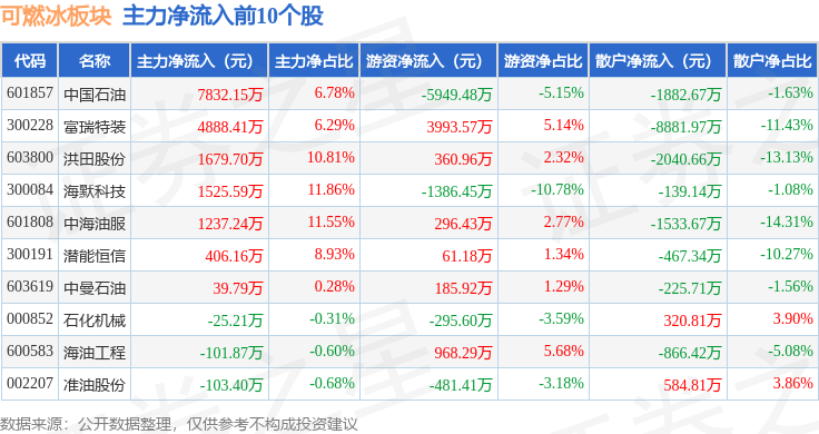 从资金流向上来看,当日可燃冰板块主力资金净流出1.22亿元,游资资金净流入1.01亿元,散户资金净流入2124.47万元。可燃冰板块个股资金流向见下表: