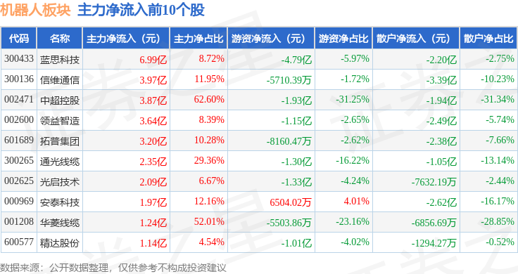 从资金流向上来看,当日机器人板块主力资金净流出133.03亿元,游资资金净流入19.73亿元,散户资金净流入113.3亿元。机器人板块个股资金流向见下表: