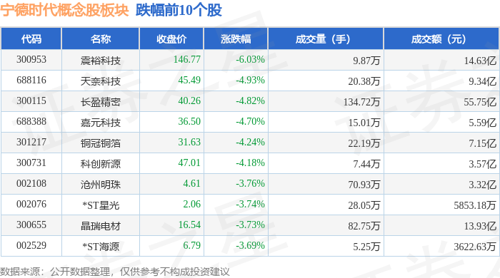 从资金流向上来看,当日宁德时代概念股板块主力资金净流出25.98亿元,游资资金净流入10.85亿元,散户资金净流入15.13亿元。宁德时代概念股板块个股资金流向见下表: