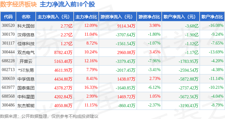 从资金流向上来看,当日数字经济板块主力资金净流出124.08亿元,游资资金净流入23.19亿元,散户资金净流入100.89亿元。数字经济板块个股资金流向见下表: