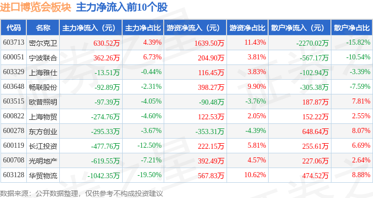 从资金流向上来看,当日进口博览会板块主力资金净流出9988.58万元,游资资金净流入4447.01万元,散户资金净流入5541.57万元。进口博览会板块个股资金流向见下表: