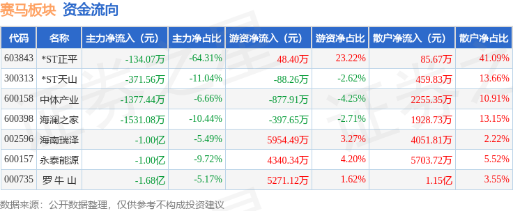 从资金流向上来看,当日赛马板块主力资金净流出4.03亿元,游资资金净流入1.43亿元,散户资金净流入2.6亿元。赛马板块个股资金流向见下表: