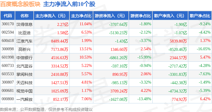 从资金流向上来看,当日百度概念股板块主力资金净流出80.61亿元,游资资金净流入14.63亿元,散户资金净流入65.97亿元。百度概念股板块个股资金流向见下表:
