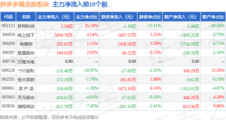 从资金流向上来看,当日拼多多概念股板块主力资金净流出5.95亿元,游资资金净流出7494.58万元,散户资金净流入6.7亿元。拼多多概念股板块个股资金流向见下表: