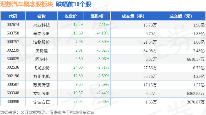 证券之星消息,12月11日理想汽车概念股板块较上一交易日下跌1.28%,兴业科技领跌。当日上证指数报收于3873.32,下跌0.7%。深证成指报收于13147.39,下跌1.27%。理想汽车概念股板块个股涨跌见下表: