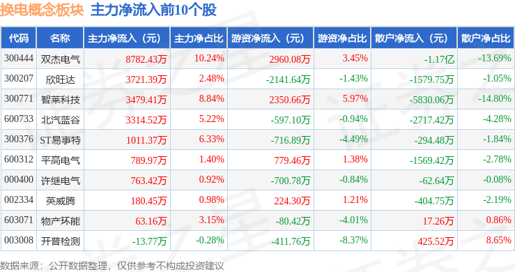 从资金流向上来看,当日换电概念板块主力资金净流出5.88亿元,游资资金净流入2.29亿元,散户资金净流入3.59亿元。换电概念板块个股资金流向见下表: