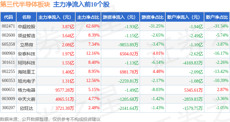 从资金流向上来看,当日第三代半导体板块主力资金净流出86.86亿元,游资资金净流入15.87亿元,散户资金净流入70.99亿元。第三代半导体板块个股资金流向见下表: