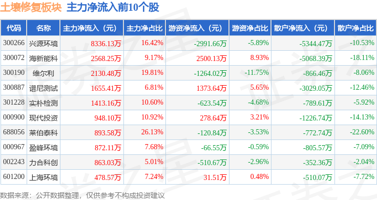 从资金流向上来看,当日土壤修复板块主力资金净流出7.72亿元,游资资金净流入2.85亿元,散户资金净流入4.86亿元。土壤修复板块个股资金流向见下表: