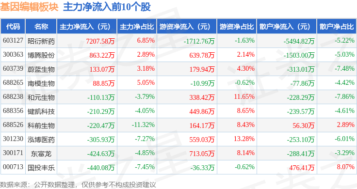 从资金流向上来看,当日基因编辑板块主力资金净流出2.04亿元,游资资金净流入1.35亿元,散户资金净流入6942.31万元。基因编辑板块个股资金流向见下表: