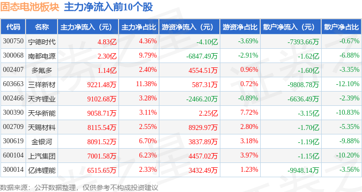 从资金流向上来看,当日固态电池板块主力资金净流出19.37亿元,游资资金净流入10.32亿元,散户资金净流入9.05亿元。固态电池板块个股资金流向见下表: