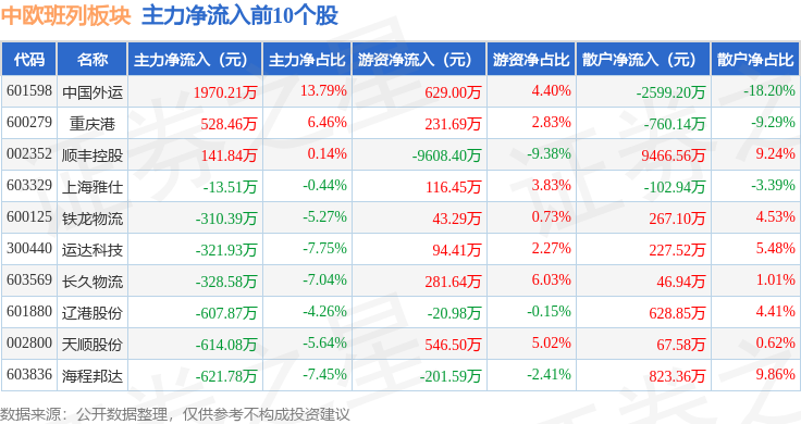 从资金流向上来看,当日中欧班列板块主力资金净流出3.22亿元,游资资金净流出2628.04万元,散户资金净流入3.48亿元。中欧班列板块个股资金流向见下表:
