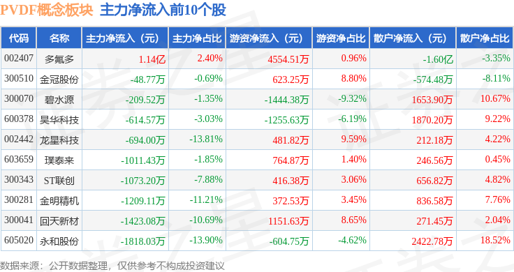 从资金流向上来看,当日PVDF概念板块主力资金净流出2.88亿元,游资资金净流入1.22亿元,散户资金净流入1.67亿元。PVDF概念板块个股资金流向见下表: