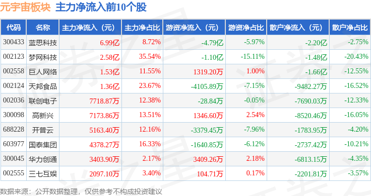 从资金流向上来看,当日元宇宙板块主力资金净流出34.39亿元,游资资金净流入2.22亿元,散户资金净流入32.17亿元。元宇宙板块个股资金流向见下表: